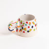 Colorful paint dabs and splatters adorn this chubby stoneware mug. The chunky shape makes it very satisfying mug for you to nurse a hot beverage. Plus, the colorful design makes this a fun mug for your morning beverage.