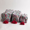 Discover the charm of tradition and artistry with these exquisite block print cosmetic bags. Each bag is handmade using the time-honored Indian block print technique, ensuring a unique and timeless design that's crafted with care and so much love. Available in small, medium large, they are Ideal for storing everything from cosmetics and perfect for travel. Chic and whimsical tassels add an elegant finish.