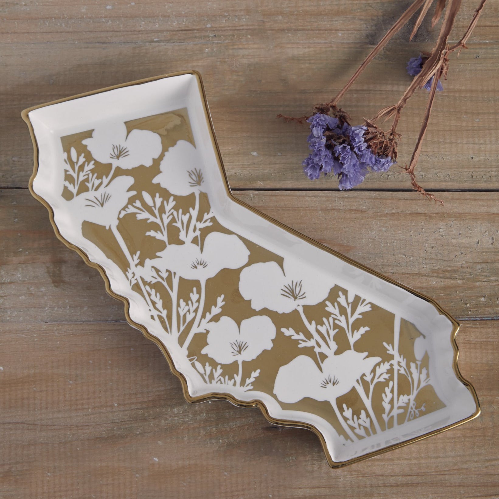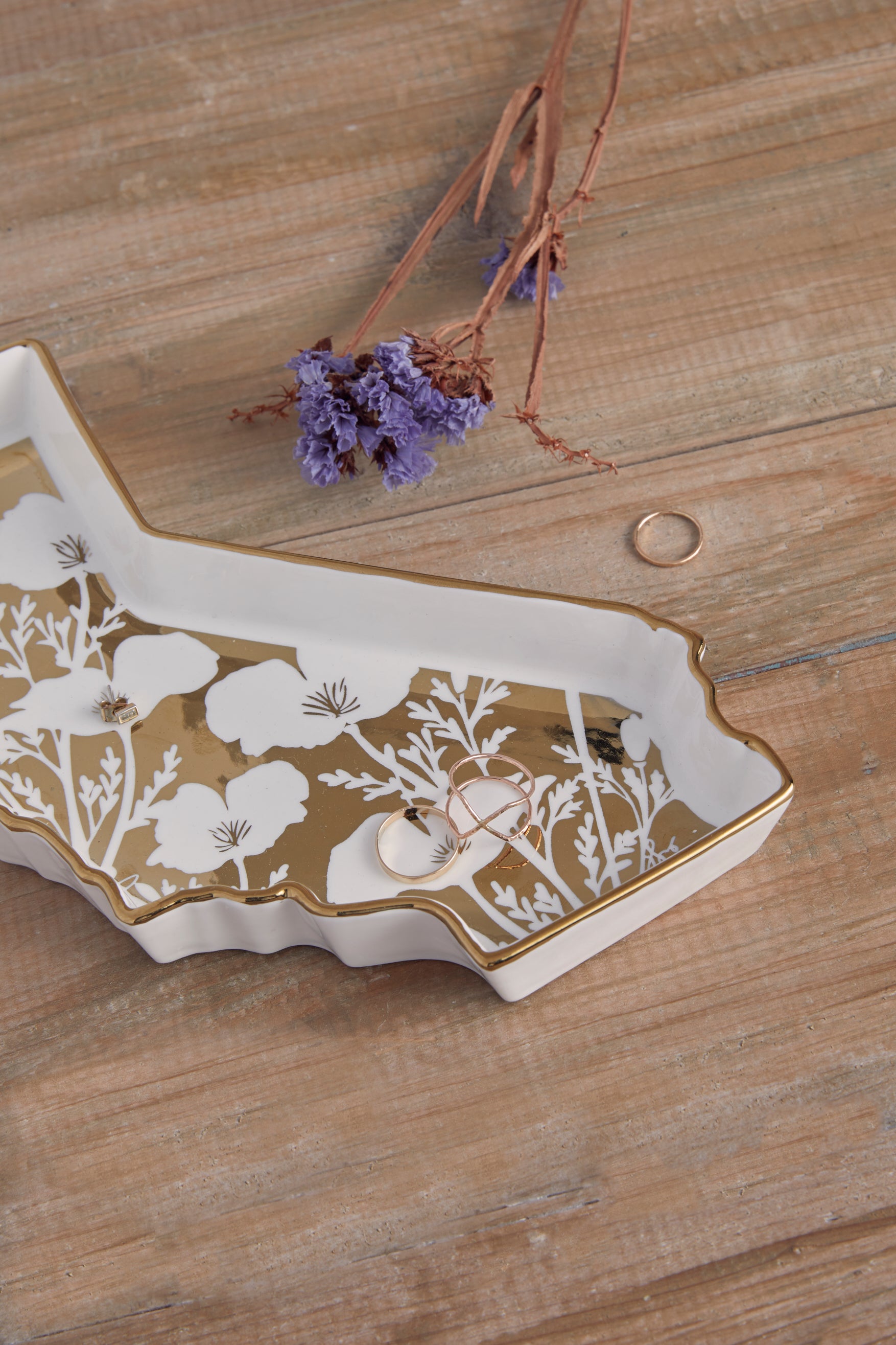 A beautiful tribute to our Golden State. A trinket dish in the shape of California decorated with the California state flower, poppy, in gold foil.